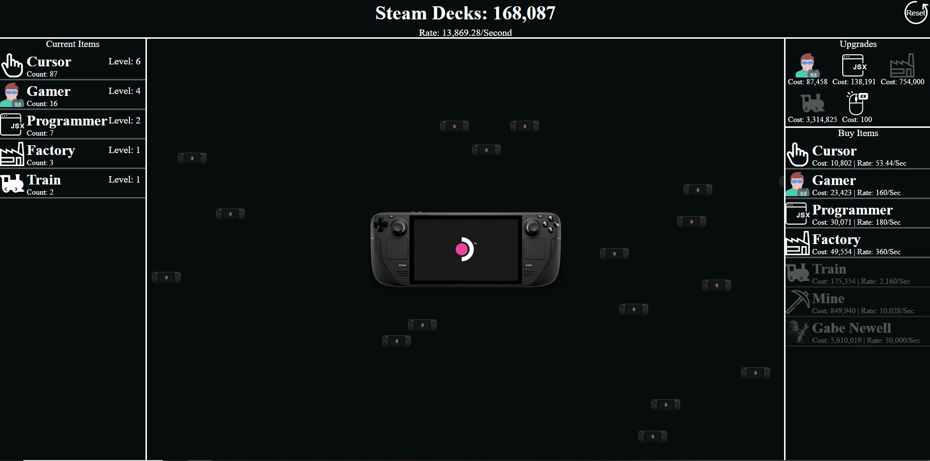 This game is a simple clicker game I made for fun while waiting for my Steam Deck. There are a couple generators that you can utilise quite quickly to generate even more Steam Decks every second, with upgrades available for each one.